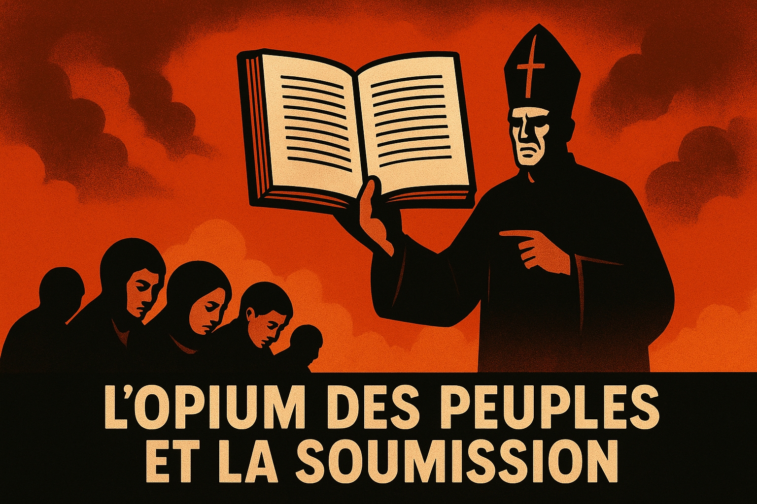 La religion sert d’opium social : elle promet récompense céleste pour la soumission terrestre, détournant les opprimés de la révolte et consolidant l’autorité des maîtres politiques et religieux.